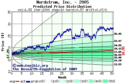 The following graph plots the year-to-date performance of the stock for 2005 compared to the probability calculated by a random walk model.