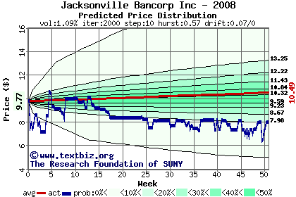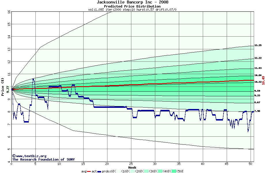 The following graph plots the year-to-date performance of the stock for 2008 compared to the probability calculated by a random walk model.