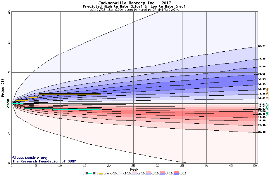The high to date and low to date prices of the stock plotted against a random walk model for 2017 (what's this?).
