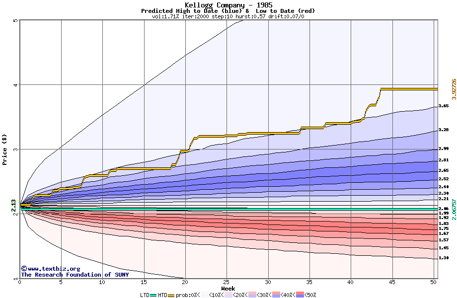 The high to date and low to date prices of the stock plotted against a random walk model for 1985 (what's this?).