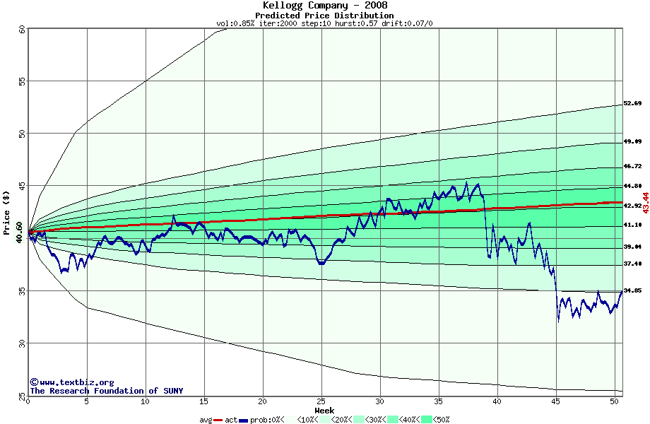 The following graph plots the year-to-date performance of the stock for 2008 compared to the probability calculated by a random walk model.