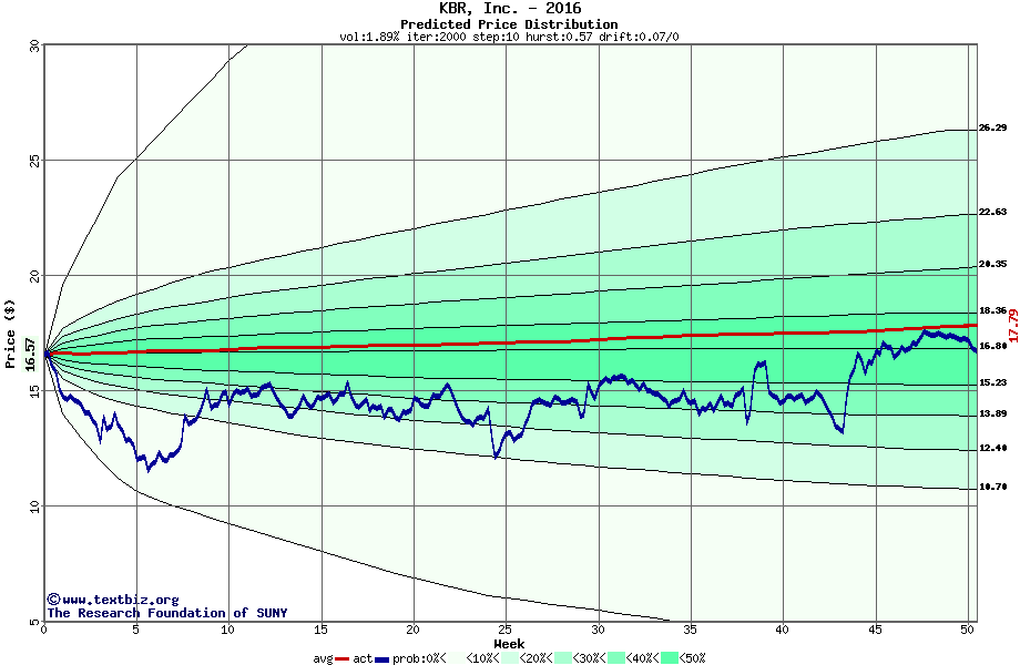 The high to date and low to date prices of the stock plotted against a random walk model for 2016 (what's this?).