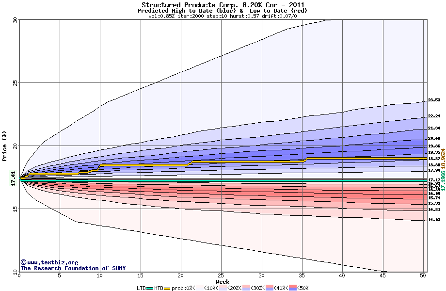 The high to date and low to date prices of the stock plotted against a random walk model for 2011 (what's this?).