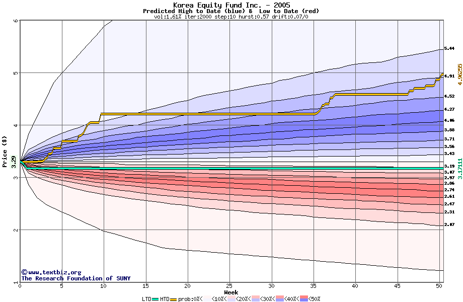 The high to date and low to date prices of the stock plotted against a random walk model for 2005 (what's this?).
