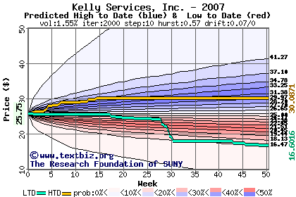 The high to date and low to date prices of the stock plotted against a random walk model for 2007 (what's this?).