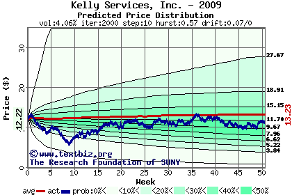 The high to date and low to date prices of the stock plotted against a random walk model for 2009 (what's this?).