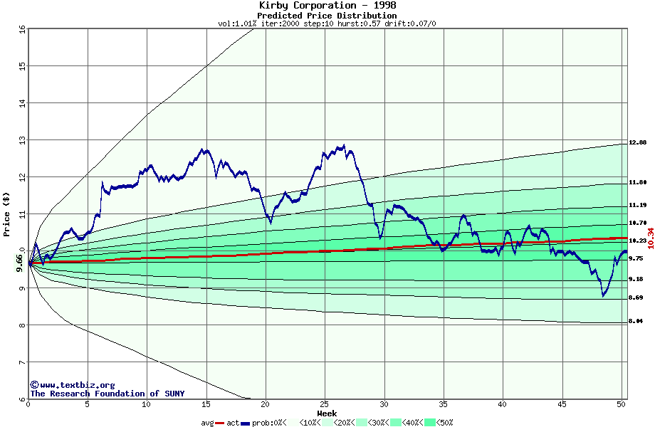 The following graph plots the year-to-date performance of the stock for 1998 compared to the probability calculated by a random walk model.