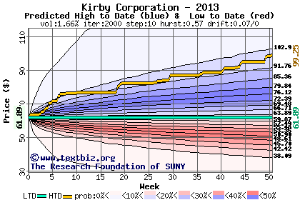The high to date and low to date prices of the stock plotted against a random walk model for 2013 (what's this?).