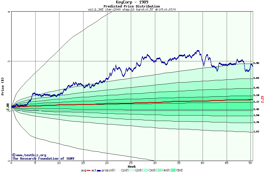 The high to date and low to date prices of the stock plotted against a random walk model for 1989 (what's this?).