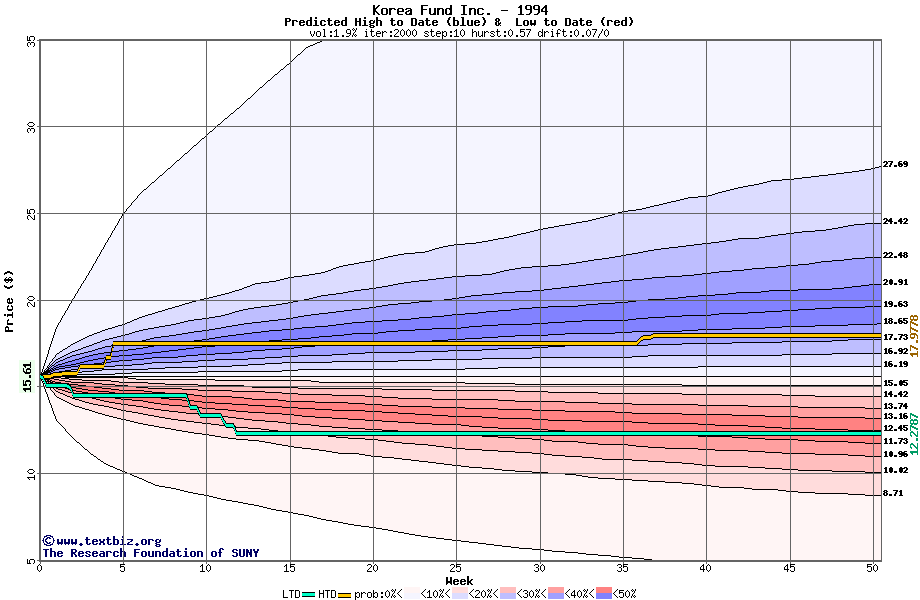 The high to date and low to date prices of the stock plotted against a random walk model for 1994 (what's this?).