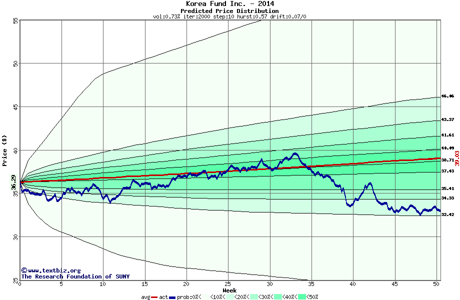 The following graph plots the year-to-date performance of the stock for 2014 compared to the probability calculated by a random walk model.