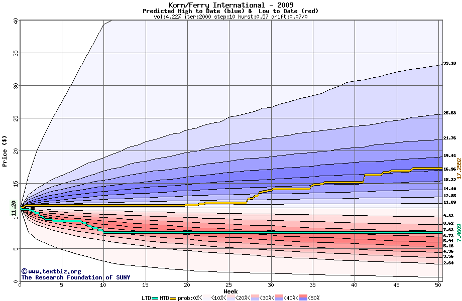 The high to date and low to date prices of the stock plotted against a random walk model for 2009 (what's this?).