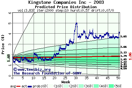 The high to date and low to date prices of the stock plotted against a random walk model for 2003 (what's this?).
