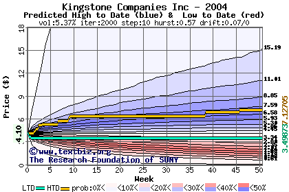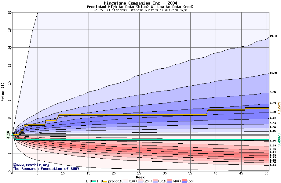 The high to date and low to date prices of the stock plotted against a random walk model for 2004 (what's this?).