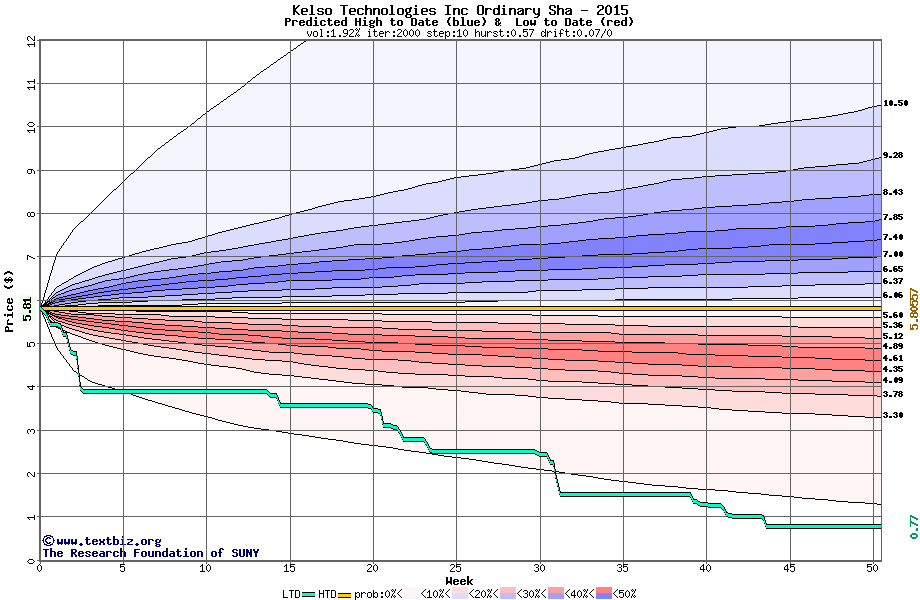 The high to date and low to date prices of the stock plotted against a random walk model for 2015 (what's this?).