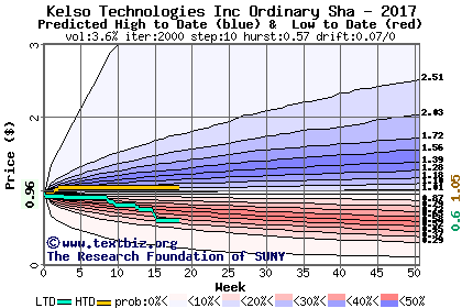 The high to date and low to date prices of the stock plotted against a random walk model for 2017 (what's this?).