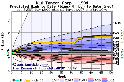 The high to date and low to date prices of the stock plotted against a random walk model for 1994 (what's this?).