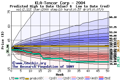 The high to date and low to date prices of the stock plotted against a random walk model for 2004 (what's this?).