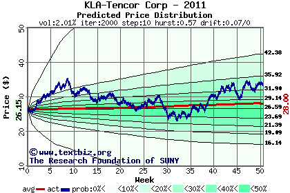 The high to date and low to date prices of the stock plotted against a random walk model for 2011 (what's this?).