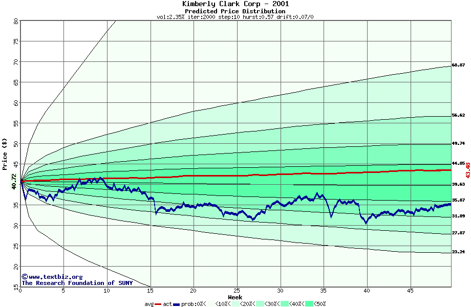 The following graph plots the year-to-date performance of the stock for 2001 compared to the probability calculated by a random walk model.