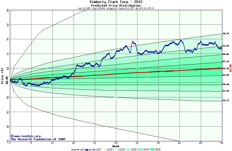 The following graph plots the year-to-date performance of the stock for 2012 compared to the probability calculated by a random walk model.