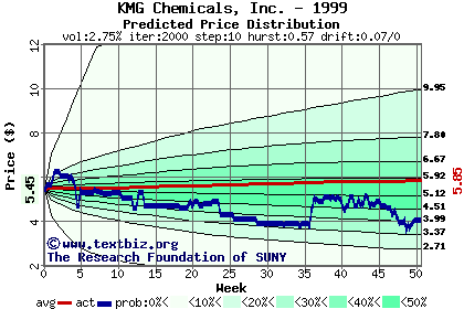The high to date and low to date prices of the stock plotted against a random walk model for 1999 (what's this?).