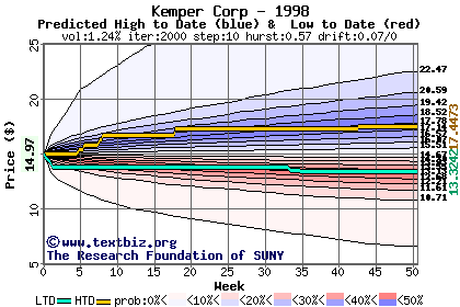 The high to date and low to date prices of the stock plotted against a random walk model for 1998 (what's this?).