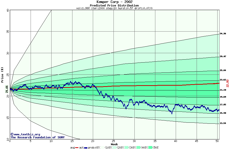 The following graph plots the year-to-date performance of the stock for 2002 compared to the probability calculated by a random walk model.