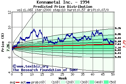 The high to date and low to date prices of the stock plotted against a random walk model for 1994 (what's this?).
