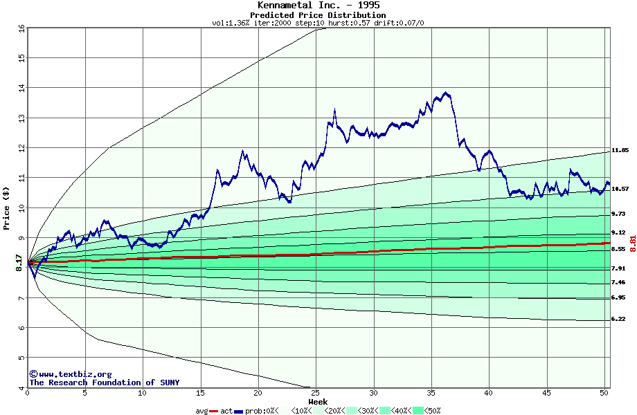The following graph plots the year-to-date performance of the stock for 1995 compared to the probability calculated by a random walk model.