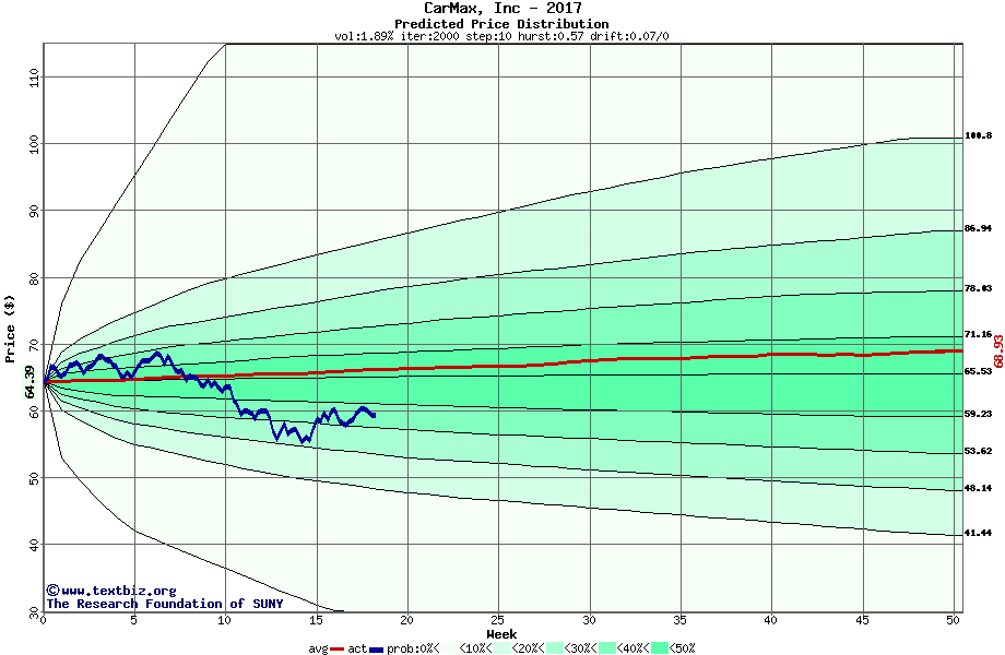 The high to date and low to date prices of the stock plotted against a random walk model for 2017 (what's this?).