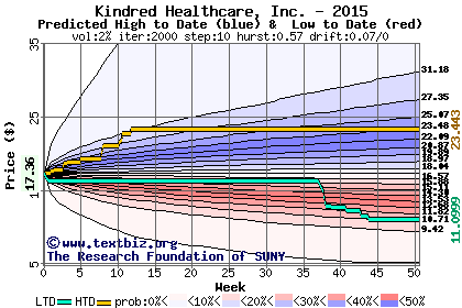 The high to date and low to date prices of the stock plotted against a random walk model for 2015 (what's this?).