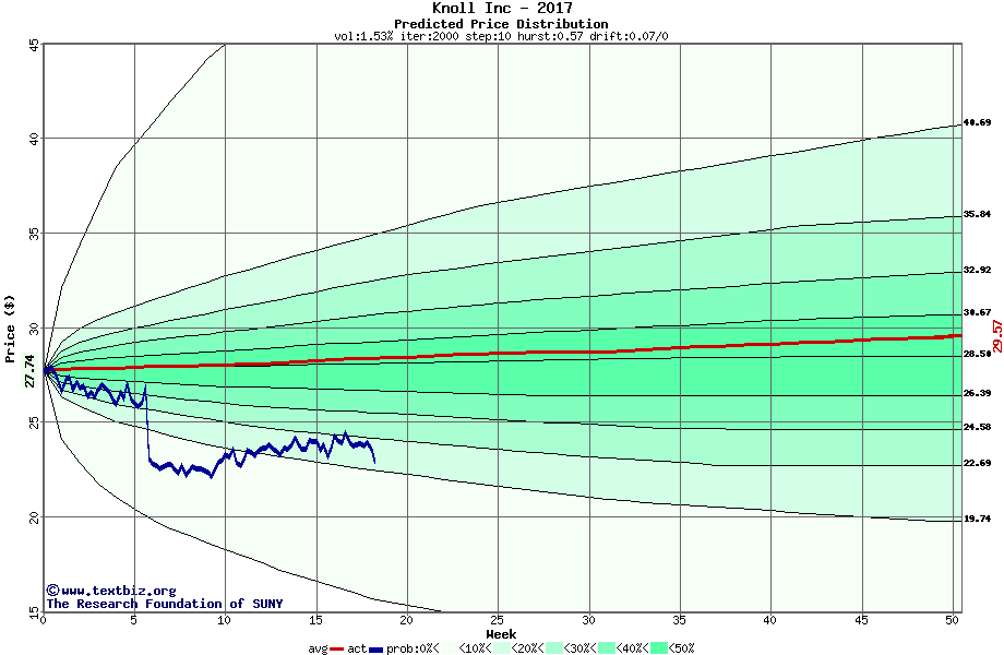 The high to date and low to date prices of the stock plotted against a random walk model for 2017 (what's this?).
