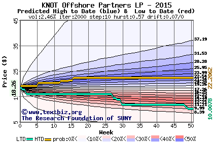 The high to date and low to date prices of the stock plotted against a random walk model for 2015 (what's this?).
