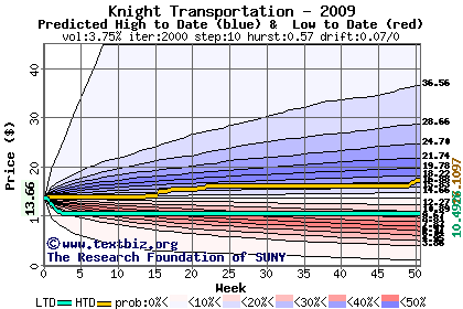 The high to date and low to date prices of the stock plotted against a random walk model for 2009 (what's this?).
