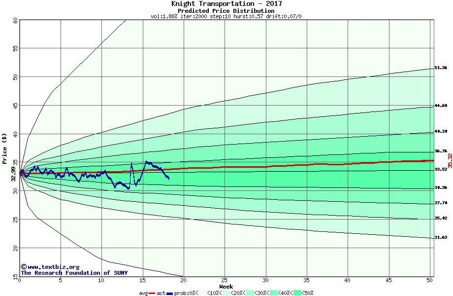 The following graph plots the year-to-date performance of the stock for 2017 compared to the probability calculated by a random walk model.