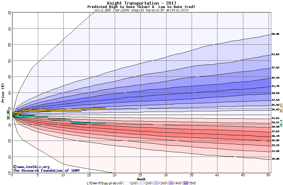 The high to date and low to date prices of the stock plotted against a random walk model for 2017 (what's this?).