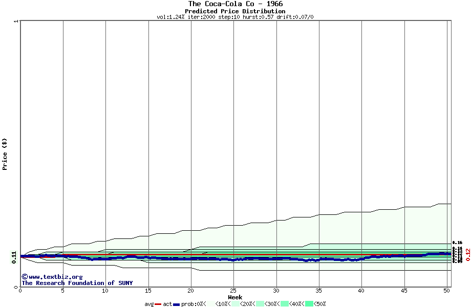 The following graph plots the year-to-date performance of the stock for 1966 compared to the probability calculated by a random walk model.