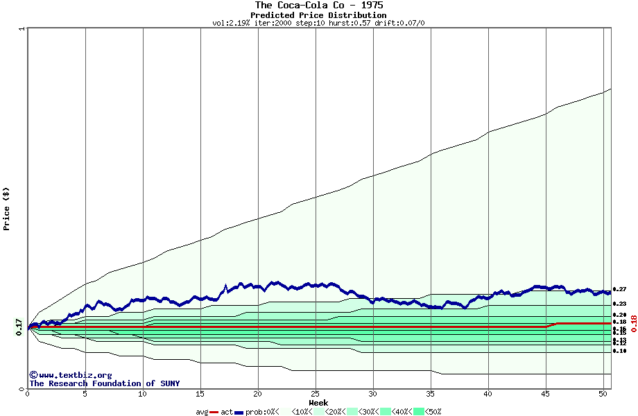 The following graph plots the year-to-date performance of the stock for 1975 compared to the probability calculated by a random walk model.