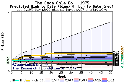 The high to date and low to date prices of the stock plotted against a random walk model for 1975 (what's this?).