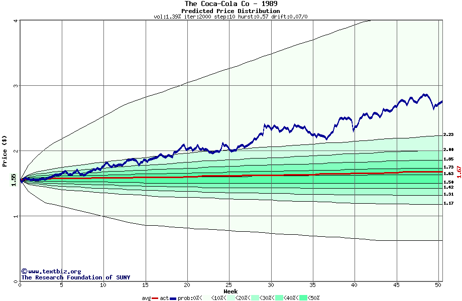 The following graph plots the year-to-date performance of the stock for 1989 compared to the probability calculated by a random walk model.