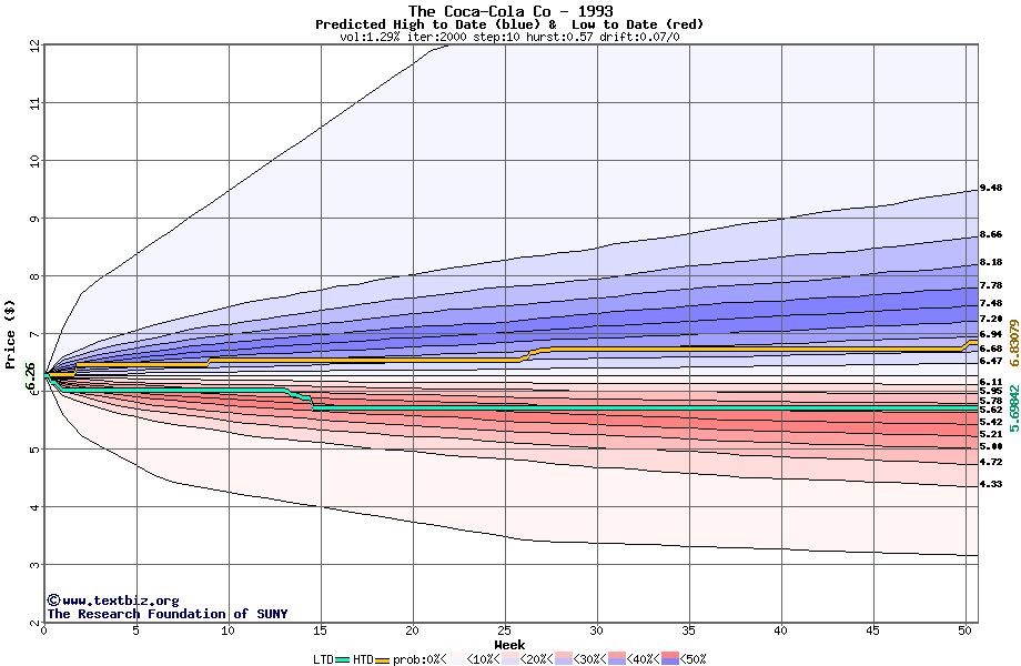 The high to date and low to date prices of the stock plotted against a random walk model for 1993 (what's this?).