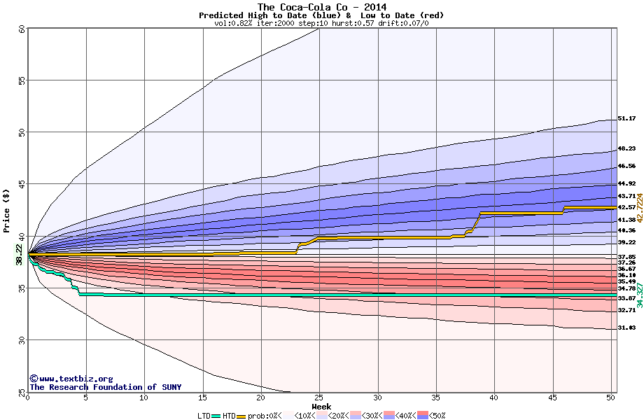 The following graph plots the year-to-date performance of the stock for 2014 compared to the probability calculated by a random walk model.