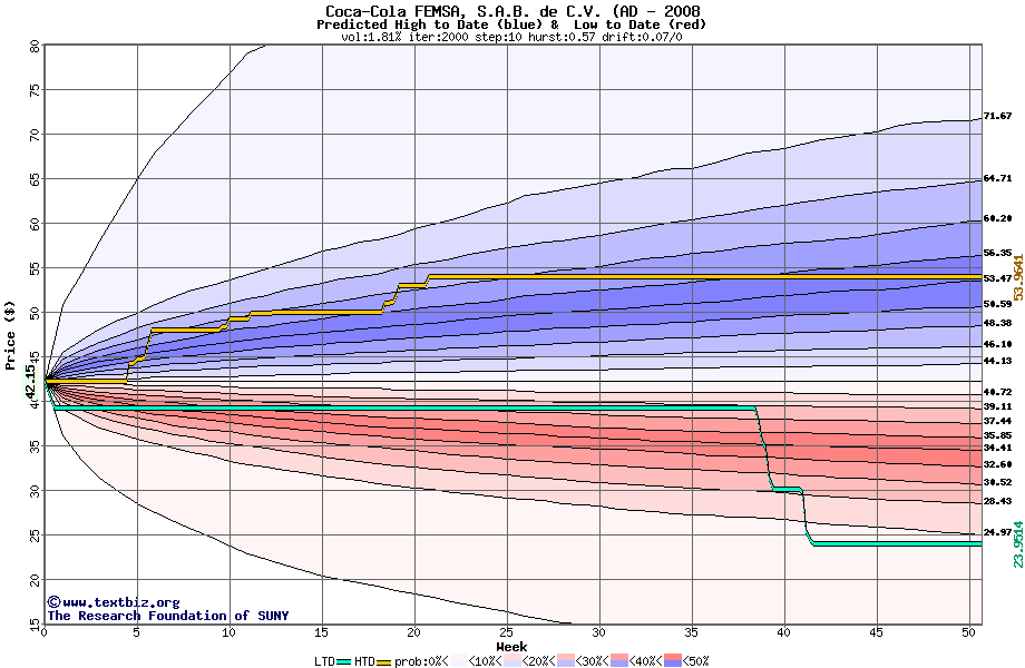The high to date and low to date prices of the stock plotted against a random walk model for 2008 (what's this?).