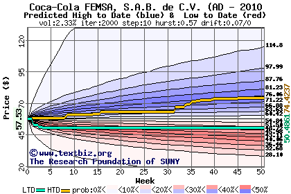 The high to date and low to date prices of the stock plotted against a random walk model for 2010 (what's this?).