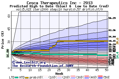 The high to date and low to date prices of the stock plotted against a random walk model for 2013 (what's this?).