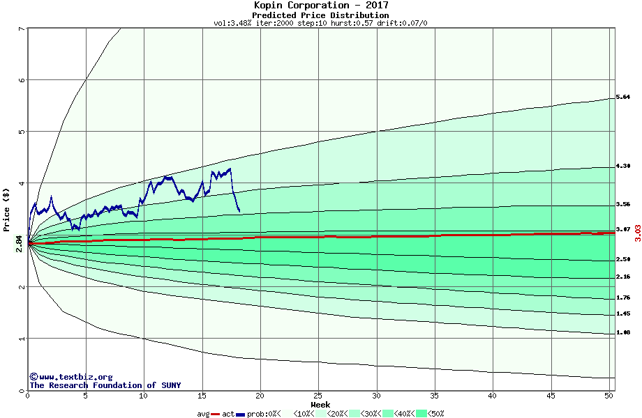 The high to date and low to date prices of the stock plotted against a random walk model for 2017 (what's this?).