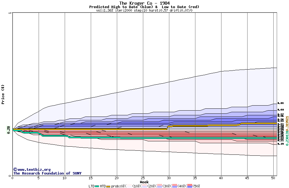 The high to date and low to date prices of the stock plotted against a random walk model for 1984 (what's this?).