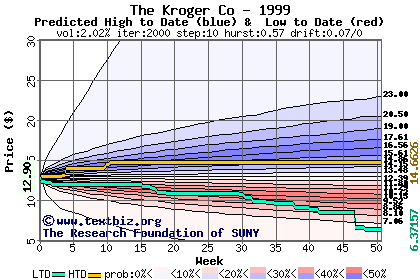 The high to date and low to date prices of the stock plotted against a random walk model for 1999 (what's this?).