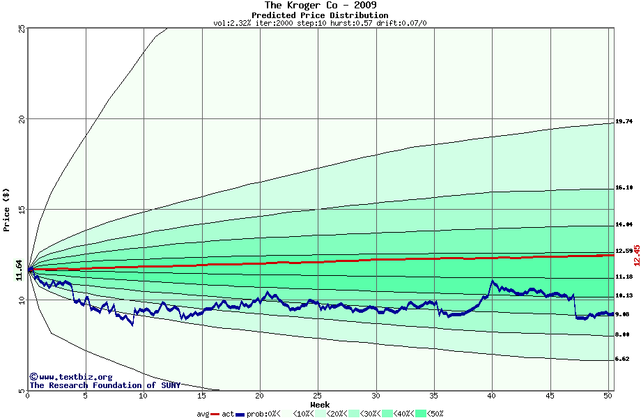The following graph plots the year-to-date performance of the stock for 2009 compared to the probability calculated by a random walk model.